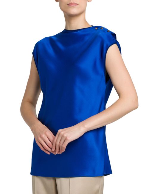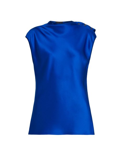 This Giorgio Armani's elegant blouse is crafted of radiant silk satin with a draped button detail at the shoulder. Funnelneck Buttoned shoulder Cap sleeves Pulls over 100% silk Dry clean Made in Italy SIZE & FIT About 26" from shoulder to hem Model measurements: 5'10" tall Model is wearing a US size 4 ABOUT THE BRAND Since launching his self-named fashion empire in 1975, Milanese designer Giorgio Armani has both revolutionized women's and men's fashion, and the fashion industry writ large. His now signature silhouettes forged new directions at the time, with more natural fits and neutral colors. To this day, the Armani name is synonymous with an effortless and approachable Italian aesthetic that can be found in its expertly tailored clothing, accessories and beauty collections. Advanced European - B30 Consignment > Giorgio Armani > Saks Fifth Avenue > Barneys. Giorgio Armani. Color: Humming Bird. Size: 0.