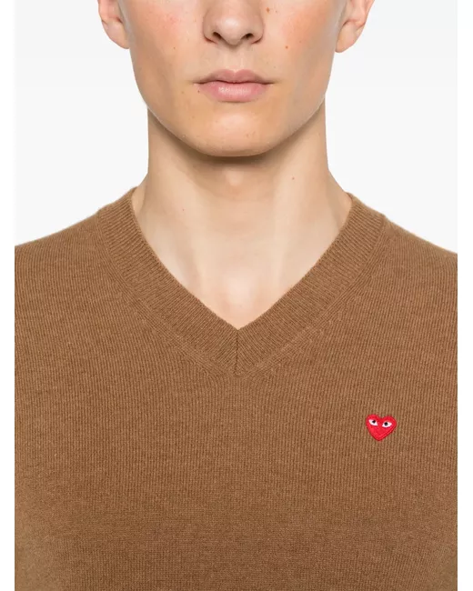light brown wool fine knit ribbed V-neck long sleeves ribbed cuffs signature heart patch ribbed hem When buying this unisex item, keep in mind that it is graded in standard men's sizing.