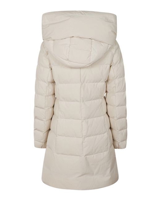 Down jacket in stretch nylon milky cream color 90% duck down padding 10% feather fastening with zip and press studs hood with drawstring flap pockets with button side zip frog at the bottom of the sleeve with iconic windproof cuff patch