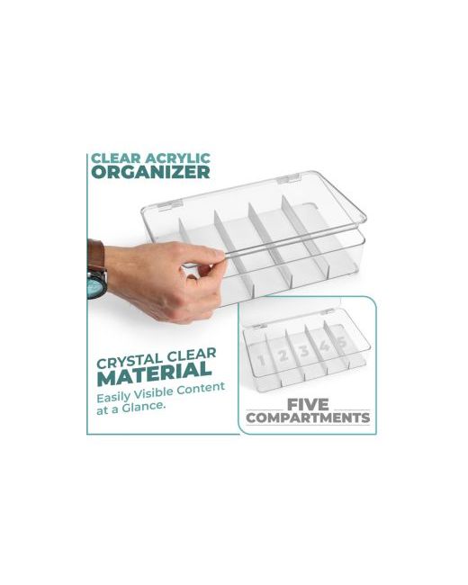 The Sorbus Sunglasses Holder features five divided compartments, providing a neat and convenient storage solution for your favorite pairs of glasses. Whether you need to store sunglasses, prescription glasses, readers, protective eyewear, or fashion accessories, this clear, shatter-resistant acrylic holder offers easy visibility and durability. It is multifunctional and can be placed in your closet, bathroom, bedroom, vanity, kid's room, or entryway. The compartments are versatile and can also be used to organize jewelry, necklaces, cosmetics, watches, smartwatches, and other everyday essentials. Its stackable design is perfect for maximizing vertical storage in small living spaces such as apartments and townhouses, allowing you to effortlessly categorize your eyewear collection by type. The attached lid with a recessed steel hinge ensures your glasses are protected from dust, dirt, and damage, providing a secure closure.