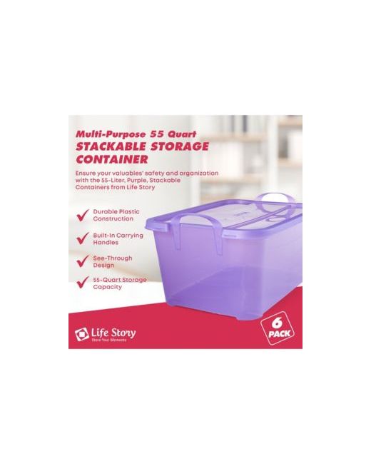 Keep your life clean and organized with the Life Story storage box container. This package includes 6 55-quart boxes.The 55-quart tote is ideal for storing items such as blankets to winter clothes. The snap locking lid keeps the items dust-free and damage-free and the built-in carrying handles make it easy to move your items from place to place. The storage totes are also stackable, which helps to free up even more space in your home or garage.Declutter your bedroom to your storage room with the Life Story clear box storage container.