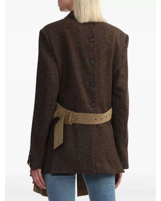 coffee brown wool blend twill weave speckled effect detachable and adjustable draped waist belt buckle fastening double-breasted button fastening wide peak lapels shoulder pads long sleeves buttoned cuffs chest welt pocket English rear vents draped panel detail
