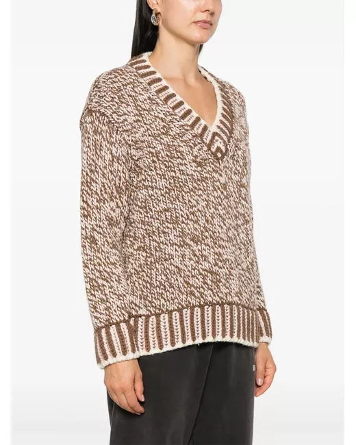 chocolate brown/beige virgin wool blend knitted construction V-neck long sleeves ribbed cuffs and hem straight hem
