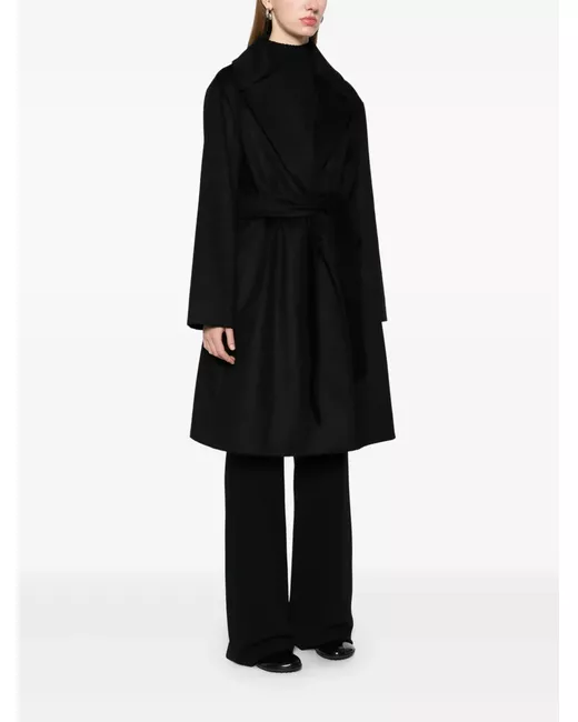 black virgin wool brushed finish notched lapels long sleeves two side inset pockets detachable waist belt full lining straight hem