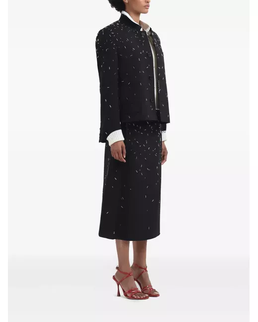 black virgin wool bead embellishment front button fastening band collar embroidered logo to the side long sleeves chest welt pocket faux pocket detail raw-cut hem strap detailing