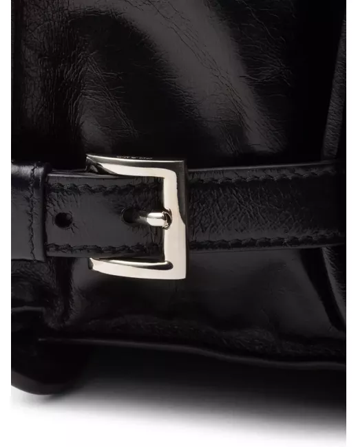black calf leather glossy finish foldover top with magnetic fastening adjustable shoulder strap enamel triangle logo to the front decorative side straps rear zip-fastening pocket main compartment internal logo plaque internal zip-fastening pocket This piece comes complete with a protective dust bag.