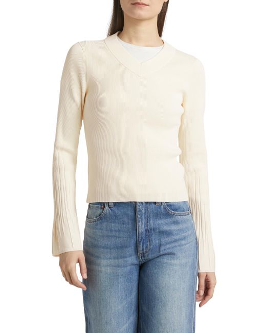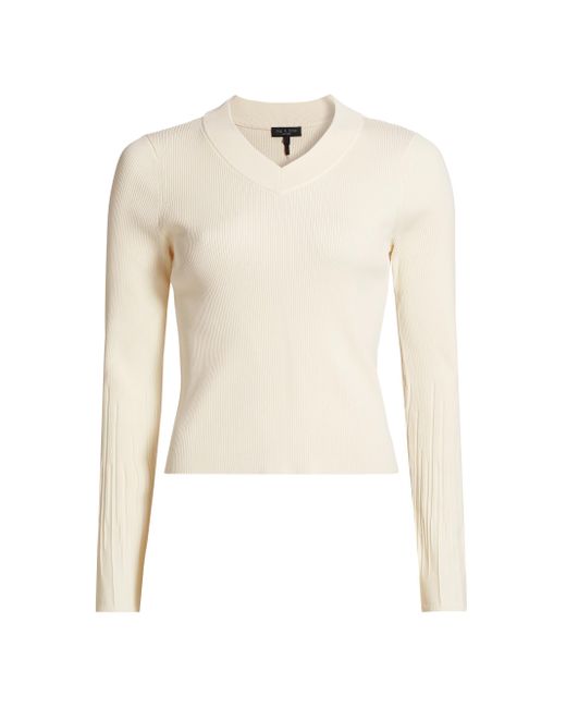 Pleated at the cuffs, rag & bone's Austen sweater showcases a banded V-neck and a fitted silhouette. V-neck Long sleeves Pulls over 63% viscose/34% nylon/3% spandex Dry clean Imported SIZE & FIT About 20.5" from shoulder to hem Model measurements: 5'10" tall Model is wearing a US size Small ABOUT THE BRAND In 2002, rag & bone founder Marcus Wainwright combined his British heritage with a downtown-New York aesthetic to set the tone for the label. At the heart of the edgy-yet-laid-back brand is its focus on quality craftsmanship and attention to detail. The epitome of cool, off-duty style, it's no wonder the signature second-skin denim is favored by many. Contemporary Sportswear - Rag And Bone > Rag & Bone > Saks Fifth Avenue > Barneys. rag & bone. Color: Ivory. Size: XXS.
