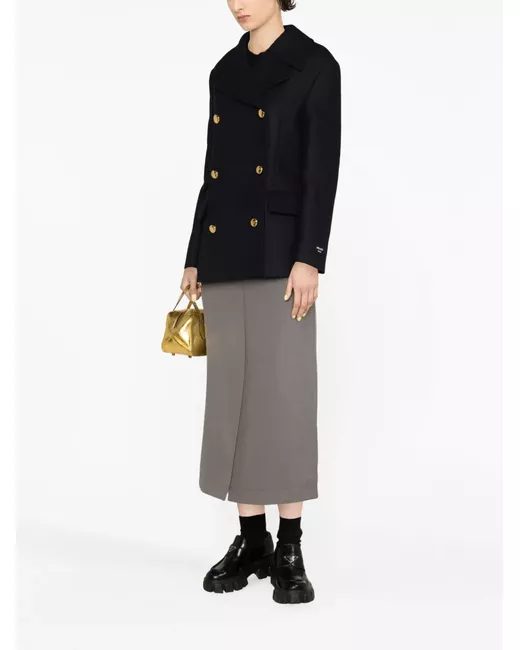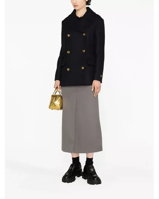 navy blue virgin wool peak lapels shoulder pads double-breasted button fastening gold-tone buttons long sleeves two side flap pockets straight hem