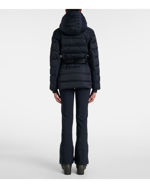 Material: 76% polyester, 24% polyurethane. Care instructions: machine wash at 30 degrees. Made in Vietnam. Designer color name: Marin. Closure: two-way zipped front. Pockets: zipped pockets. Attached belt. Lining: 94% polyester, 6% elastane. Filling: 100% polyester. Drawstring hood.