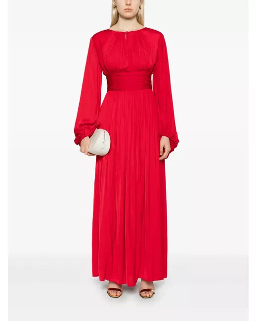 cardinal red satin weave concealed rear zip fastening keyhole neck long raglan sleeves elasticated cuffs pleat detailing full lining flared hem