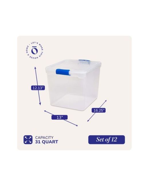 Get organized with this set of 12 new Clear Plastic Storage Containers by Homz.This popular size container is ideal for a variety of basic household needs, such as sorting and storing away clothing, toys, linens, craft supplies, seasonal decorations, and more! The ergonomic latching handles lock to secure the lid providing a comfortable grip for easy carrying. When locking, the lid snaps firmly into place to ensure all contents stay contained, concealed, and dust-free.The indexed surface of the lid allows multiple totes to stack neatly on top of each other for efficient use of vertical storage space. It's constructed from durable see-through plastic allowing you to see the contents without opening the container. The classic styling offers a refreshing, clean, and coordinated look.