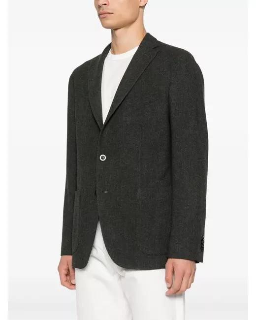 dark green wool-cashmere blend front button fastening notched lapels long sleeves buttoned cuffs chest welt pocket dart detailing two side patch pockets English rear vents multiple internal slip pockets partial lining straight hem