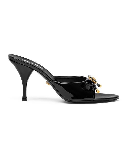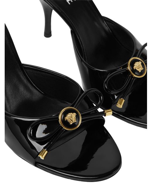 Versace's Opera Bow mules are expertly crafted in Italy from patent leather, featuring a sleek silhouette and a standout bow detail. Open toe Slips on Patent leather upper Leather lining Leather sole Made in Italy SIZE Heel: about 3.35" (85mm) ABOUT THE BRAND Founded in 1978, Versace is instantly recognizable by the signature Medusa head logo, chosen by founder Gianni Versace for its Greek symbolism. The Italian label is known for its luxe, bold clothing and accessories-think gilding, oversized logos and punchy prints. Since taking over artistic direction, Gianni's sister Donatella Versace has maintained the brand's strong identity, with a renewed vision to give customers the ultimate freedom to express themselves. Women's Shoes - European Designer Shoes > Versace > Saks Fifth Avenue > Barneys. Versace. Color: Black Versace Gold. Size: 11.