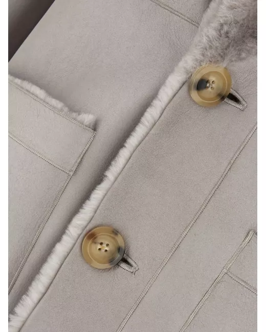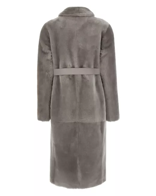 medium grey sheepskin shearling front button fastening reversible Side A: peak lapels long sleeves belted waist two side welt pockets mid-length straight hem Side B: notched lapels long sleeves frayed edge two front patch pockets straight hem mid-length