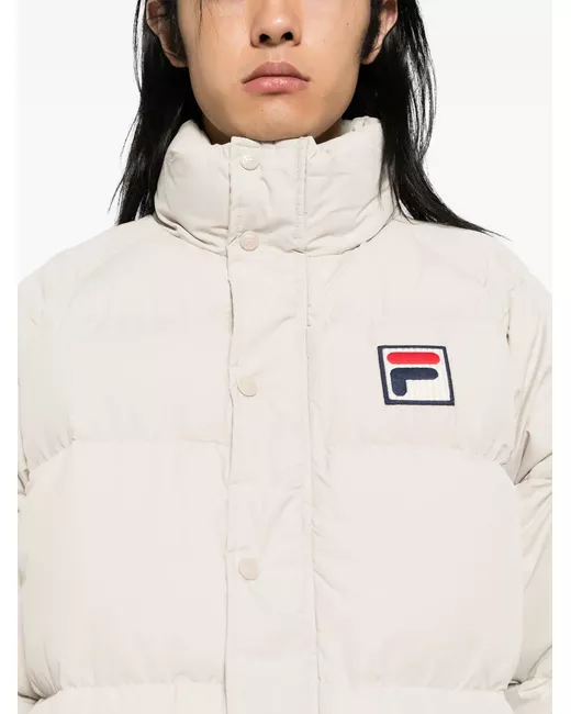 light grey padded design water-resistant concealed front zip fastening concealed front press-stud fastening funnel neck logo patch at the chest long raglan sleeves ribbed cuffs two front flap pockets contrast lining internal slip pocket