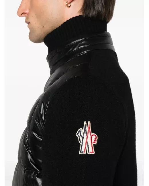 black wool blend knitted construction feather down padded panels quilted panels front zip fastening high neck long sleeves logo patch at the sleeve ribbed cuffs and hem two side zip-fastening pockets partial lining