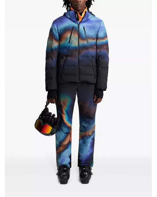 blue/multicolour abstract pattern print front zip fastening drawstring hood two zip-fastening chest pockets two side zip-fastening pockets long sleeves straight hem