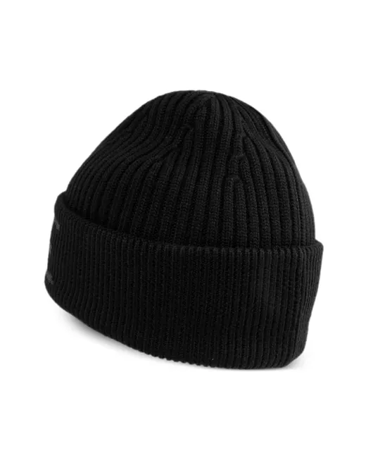 black wool ribbed knit pull-on style round crown embroidered logo to the front turn-up brim