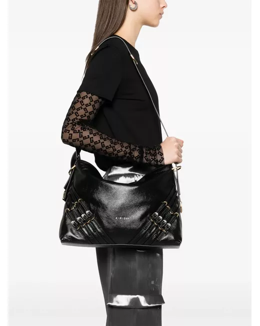 black adjustable detachable shoulder strap internal zip-fastening pocket logo stamp to the front decorative buckle detail