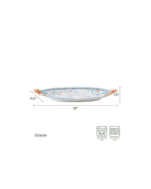Colorful and vibrant, Gracie dinnerware brings an artistic, handmade look to your tabletop. Each piece features a unique, irregular coupe shape adorned with debossed, bright florals stemming from bold blue branches, creating an eye-catching dimensional appearance. A lively addition to your dining table, this charming platter is generously sized with convenient carrying handles.