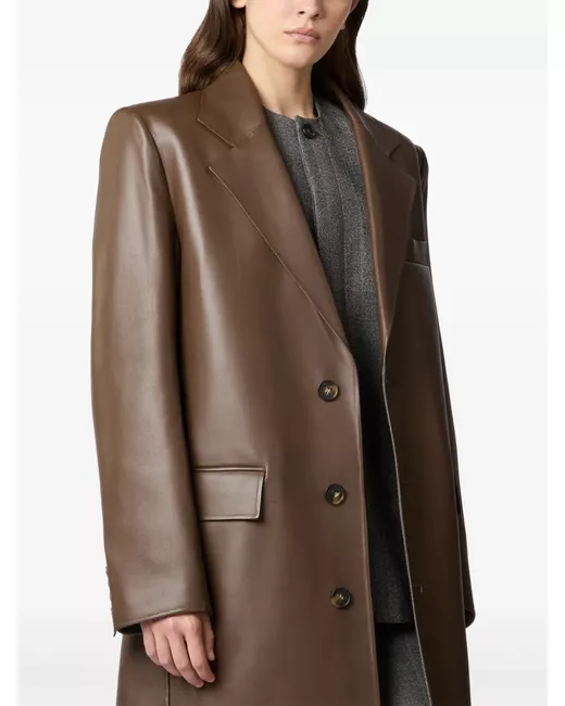 coffee brown calf leather peak lapels front button fastening chest welt pocket two front flap pockets long sleeves buttoned-cuff sleeves straight hem mid-length