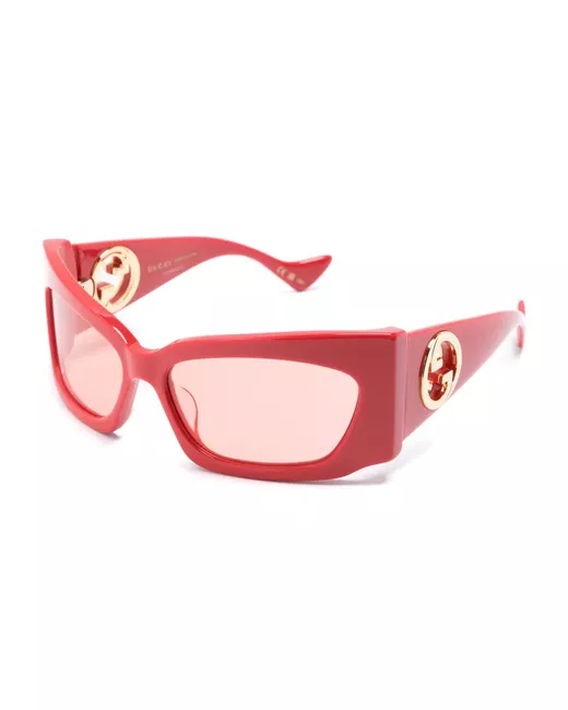 bright red acetate signature Interlocking G logo plaque gold-tone hardware rectangle frame tinted lenses sculpted arms curved tips These glasses come with a protective case.