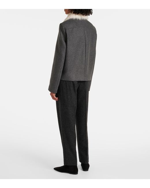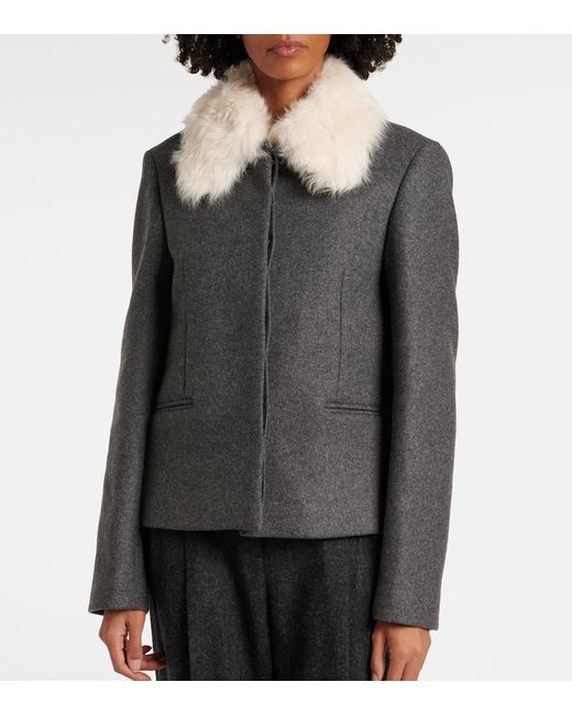 Material: 70% wool, 25% polyamide, 5% other fibres. Care instructions: dry clean. Made in Romania. Designer color name: Mid Grey Melange. Closure: concealed button placket. Lining: 100% viscose. Trim: 99.7% shearling. Contains non-textile parts of animal origin. Pockets: slit pockets.