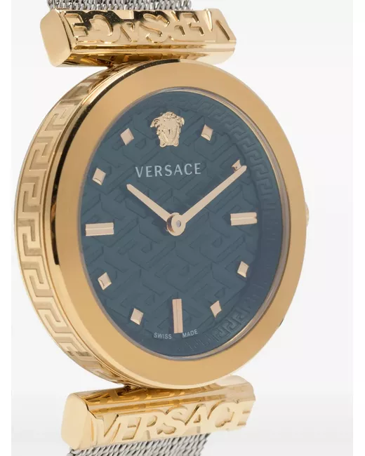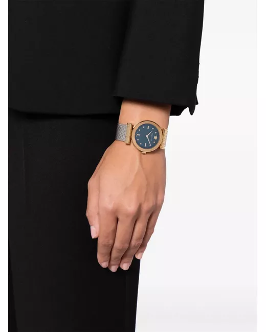 stainless steel quartz movement round face emerald green Medusa plaque detail index hands sapphire-crystal glass silver-tone mesh bracelet slide-buckle fastening water resistance up to 30m/3 ATM This item comes with a standard two-year warranty from the brand.