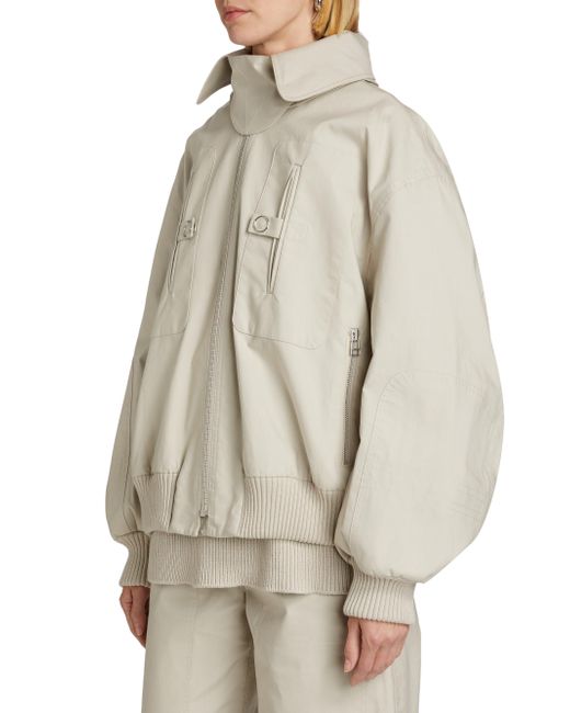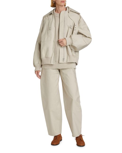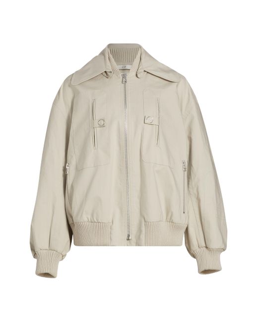 This bomber jacket from Co is crafted of cotton and styled with ribbed trim. Baseball collar Button-off spread collar with front buckle-tab Drop shoulders Long sleeves, ribbed cuffs Chest snapped welt pockets Waist zip pockets Ribbed hem Front zip closure 100% cotton Dry clean Imported SIZE & FIT About 28" from shoulder to hem Model measurements: 5'10" tall Model is wearing a US size Small. Designer Lifestyle - Designer Lifestyle Multi > Co > Saks Fifth Avenue > Barneys. Co. Color: Beige. Size: Small.