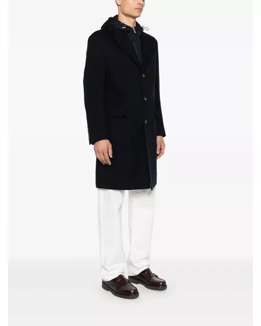 navy blue wool brushed effect front button and zip fastening detachable hooded panel notched lapels long sleeves buttoned cuffs chest welt pocket two side flap pockets central rear vent full lining straight hem mid-length