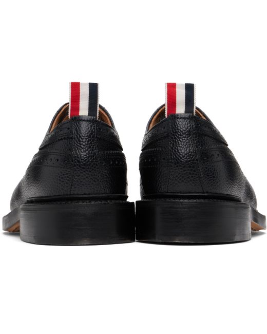 Handcrafted pebble-grained calfskin derbys in black. · Perforated and serrated detailing throughout · Lace-up closure · Tricolor grosgrain pull-loop at heel collar · Buffed leather lining · Topstitching at welt · Stacked leather heel · Metal plaques at heel and sole · Calfskin sole Supplier color: Black