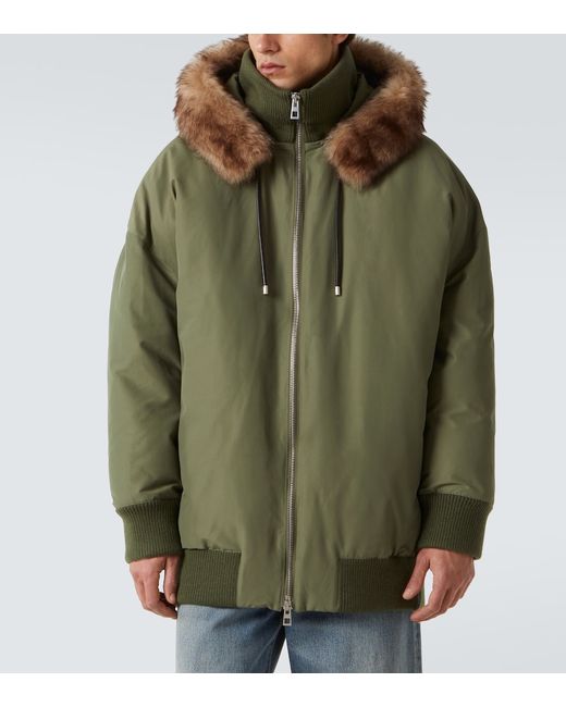 Material: 60% cotton, 40% polyamide. Care instructions: dry clean. Made in Italy. Designer color name: Khaki Green. Lining: 60% cotton, 40% polyamide. Fully lined. Filling: 100% polyester. Closure: two-way zipped front. Pockets: side slit pockets. Contains non-textile parts of animal origin. Detachable drawstring hood. Trim: 93% wool, 5% polyamide, 2% elastane. Embroidery: 100% leather.
