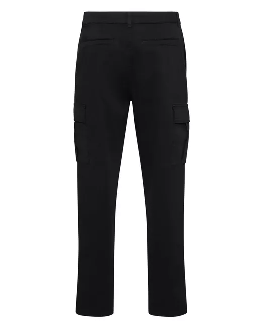 black front button and zip fastening two side inset pockets two side cargo pockets two rear welt pockets