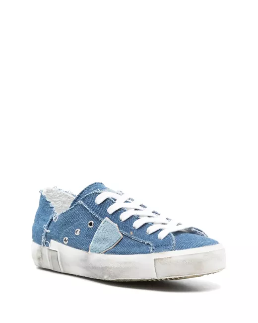 medium blue denim front lace-up fastening distressed effect eyelet vents to the side logo patch to the side logo patch at the tongue round toe branded insole flat rubber sole