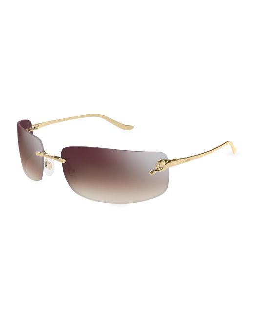 From the Panthère Classic Collection. These CT0503S rimless sunglasses from Cartier are crafted of 24-carat gold-plated metal in a rectangular design, showcasing the brand's iconic panther emblem. 100% UV protection Gradient lenses Includes case and cleaning cloth Metal Made in Italy SIZE 71mm lens width 18mm bridge width 115mm temple length Please note: Lens replacement is non-optional. Soft Accessories - Sunglasses > Cartier > Saks Fifth Avenue > Barneys. Cartier. Color: Gradient Burgundy Gold.