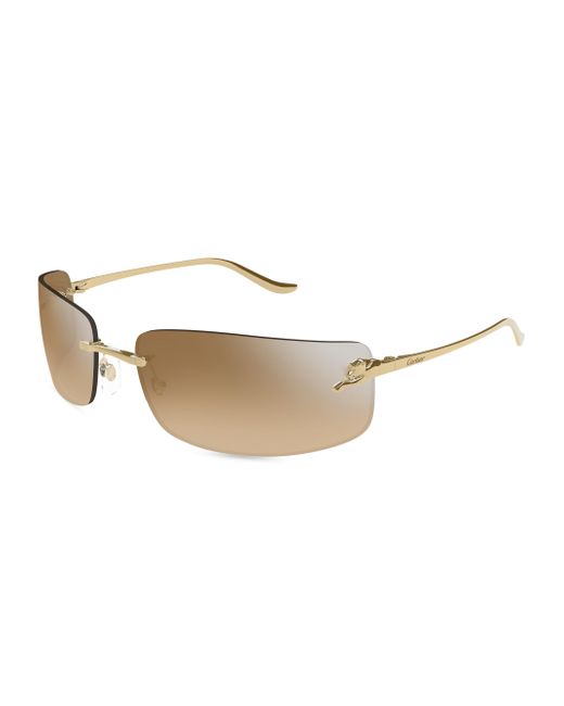 From the Panthère Classic Collection. These CT0503S rimless sunglasses from Cartier are crafted of 24-carat gold-plated metal in a rectangular design, showcasing the brand's iconic panther emblem. 100% UV protection Gradient lenses Includes case and cleaning cloth Metal Made in Italy SIZE 71mm lens width 18mm bridge width 115mm temple length Please note: Lens replacement is non-optional. Soft Accessories - Sunglasses > Cartier > Saks Fifth Avenue > Barneys. Cartier. Color: Gold Gold.