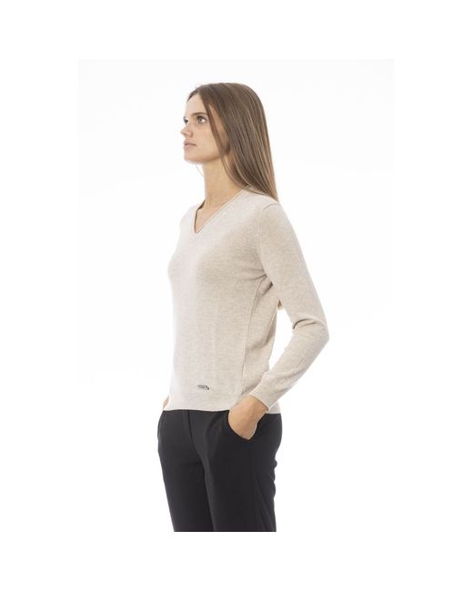 V-neck Sweater. Long Sleeves. Neck. Cuffs And Bottom Of Fine Ribbed Knit. Regular Fit. Baldinini Trend Monogram In Metal.
