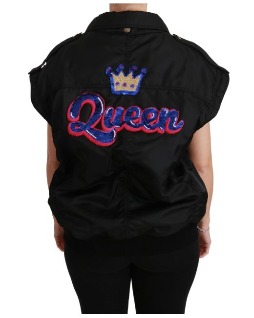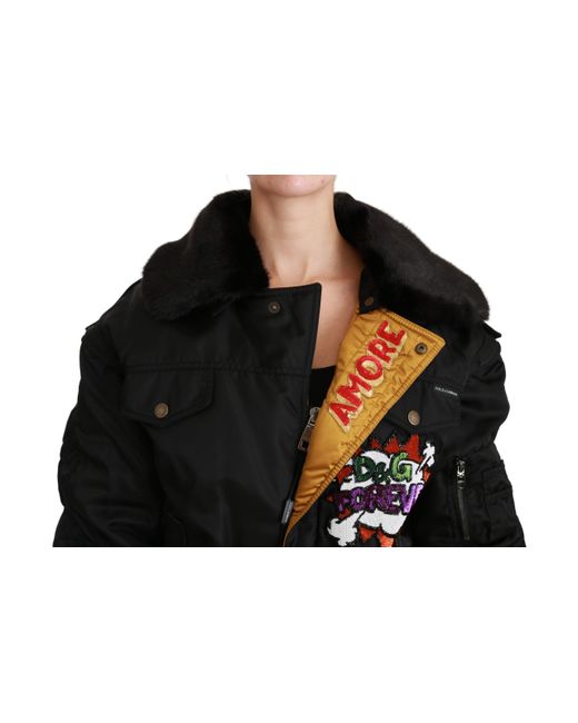 Elegant and versatile, this Dolce & Gabbana bomber jacket is a statement piece that brings together luxury and functionality. It features a sophisticated ‘Queen DG Forever’ motif, with the practicality of detachable arms and a removable faux fur collar for varied styling options. The jacket’s striking yellow inner lining contrasts beautifully with its classic black exterior, and the full button closure paired with multiple pockets marries form with utility. Tailored in Italy, this garment exemplifies the exquisite craftsmanship associated with the brand. A perfect blend of high fashion and everyday wear. Color: Black Material: 100% Nylon Lining: 100% Polyester Fur: Faux fur 85% Acrylic, 15% Polyester Country of origin: IT