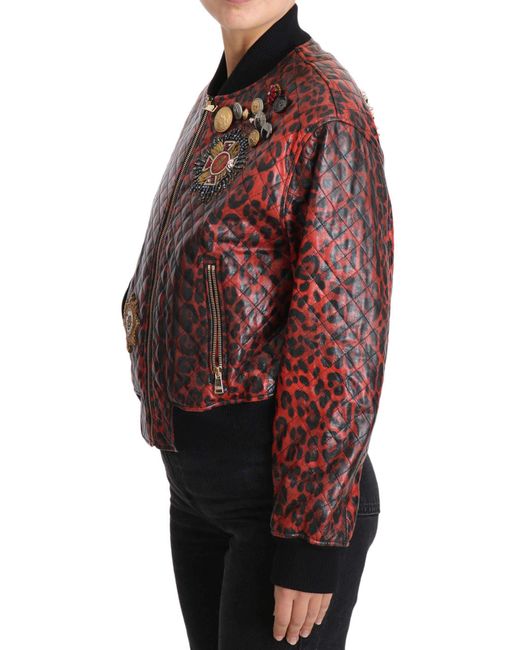 Dolce & Gabbana Gorgeous brand new with tags, 100% Authentic DOLCE & GABBANA Jacket. Model: Bomber leather jacket Color: Red Leopard Embellishment: Multicolor crystal buttons studs and patches Full zipper closure Green silk stretch inner lining Two outside pockets Logo details Made in Italy Very exclusive and great hand-sown craftsmanship Material: 90% lamb 9% Wool 1% Elastane Lining: 94% Silk 6% Elastane