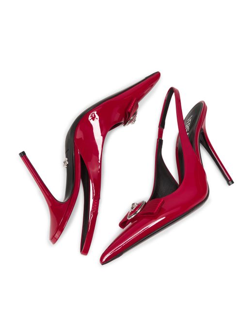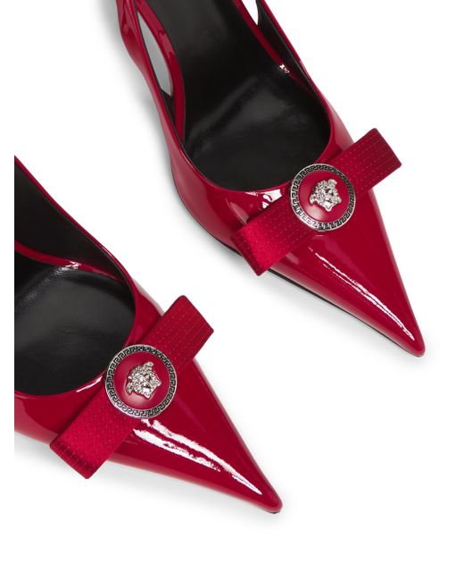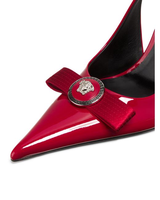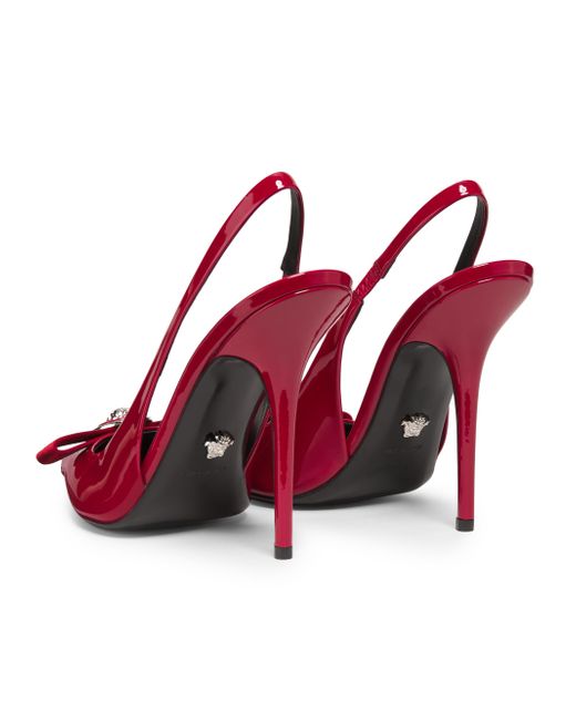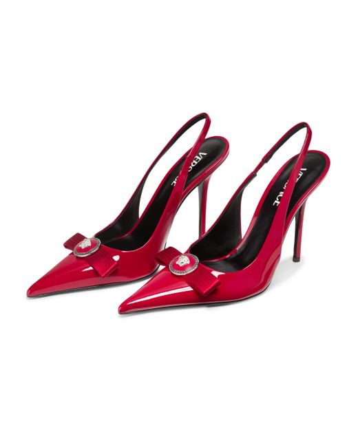 Crafted of shiny patent leather, these Versace slingback pumps are topped with a Medusa bow on the toe. Point toe Slips on Leather upper Leather sole Made in Italy SIZE Stiletto heel: about 4.25" (110mm) This brand fits slightly smaller. Consider ordering half a size up. ABOUT THE BRAND Founded in 1978, Versace is instantly recognizable by the signature Medusa head logo, chosen by founder Gianni Versace for its Greek symbolism. The Italian label is known for its luxe, bold clothing and accessories-think gilding, oversized logos and punchy prints. Since taking over artistic direction, Gianni's sister Donatella Versace has maintained the brand's strong identity, with a renewed vision to give customers the ultimate freedom to express themselves. Women's Shoes - European Designer Shoes > Versace > Saks Fifth Avenue > Barneys. Versace. Color: Lipstick Red Palladium. Size: 5.