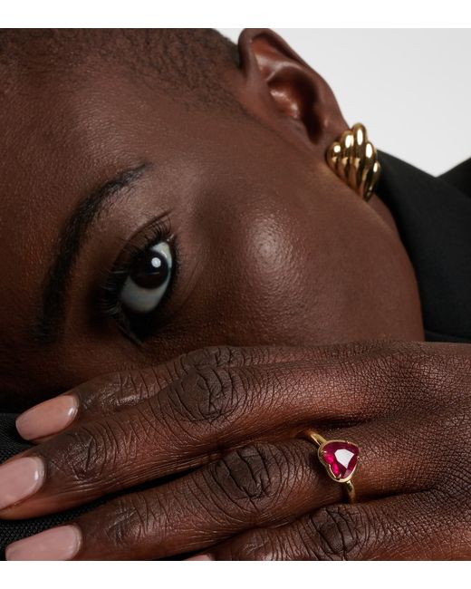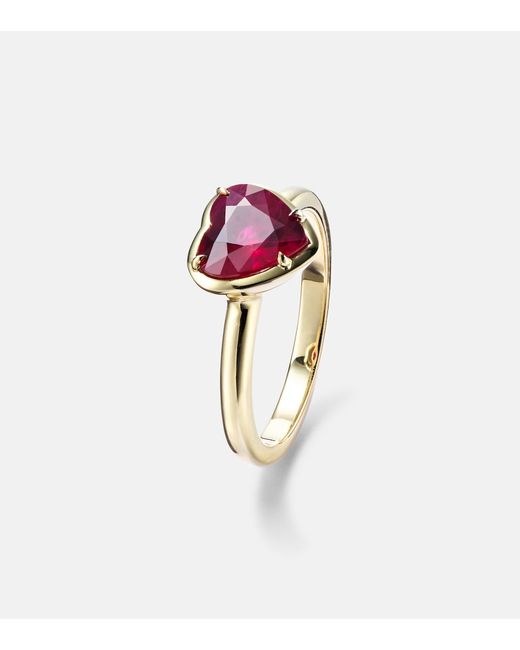 Material: 18kt yellow gold. Made in the USA. Stone I: 1 ruby, heart-shaped, bezel setting, 1.7ct.