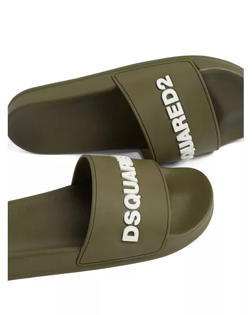 khaki faux leather embossed logo to the front slip-on style round open toe moulded footbed branded footbed flat sole