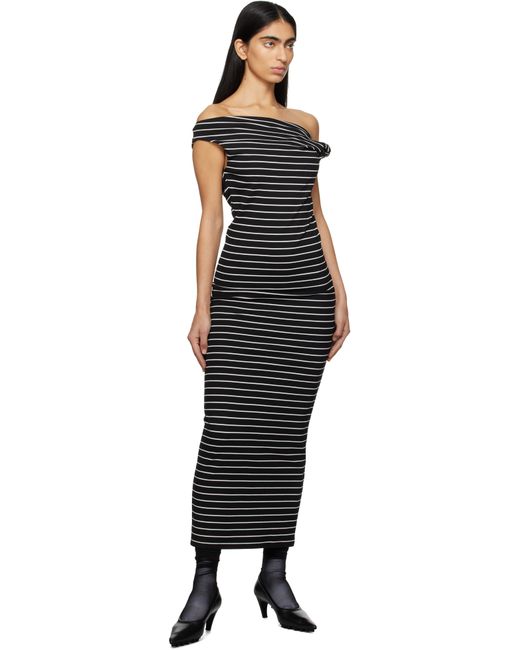 Knit stretch viscose-blend midi dress. Stripes throughout. · Off-the-shoulder construction · Twisted detailing at asymmetric neck · Logo patch at back collar Supplier color: Black
