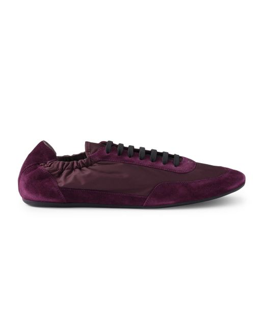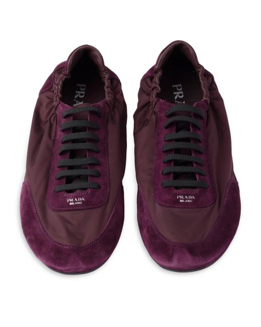 This incredibly lightweight sneakers with a structured design made of re-nylon and suede leather features a mix of materials that embodies Prada's sporty and artisanal soul. Its flat sole is enriched with elastic on the sides, making it easy to slip on. With laces Screen-printed logo on the upper Thin rubber sole Removable leather-covered insole 100% Recycled Polyamide - 100% Calf Leather Imported. Lsd Rtw - Prada Rtw > Prada > Saks Fifth Avenue > Barneys. Prada. Color: Purple. Size: 6.