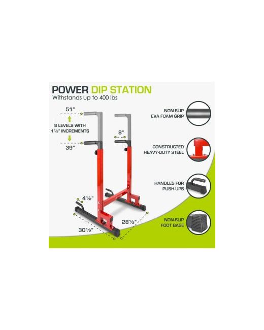Take your bodyweight exercises to the next level with the ProsourceFit Power Dip Station. Strengthen your triceps, shoulders, chest and core muscles right at home or in your gym. The free-standing structure is perfect for triceps dips, L-sit dips, bodyweight support holds, push-ups and so much more! The dip station offers 8 adjustable height positions from 39” to 51” to fit athletes of all heights. With a weight capacity of 400 lb, this structure is designed to withstand your intense workouts. The heavy-duty steel frame is designed with foam padded handles to minimalize hand fatigue during workouts. The anti-slip foot paddings keep the dip station in place during movement heavy exercises and protect your floors.