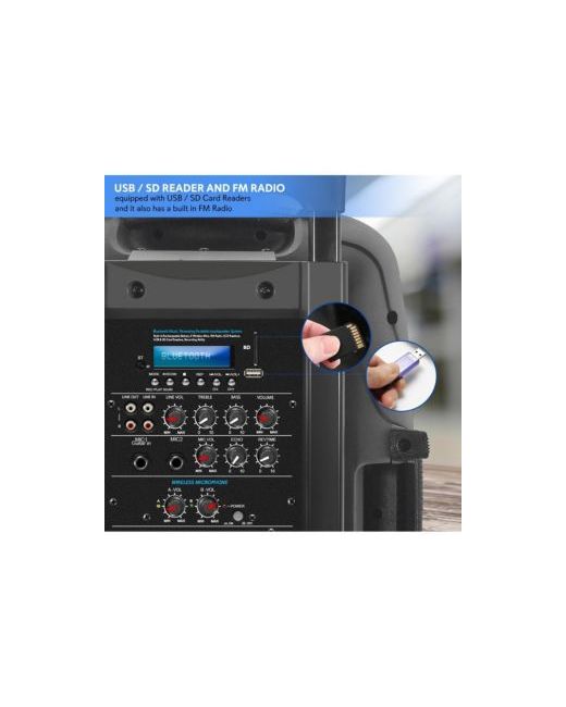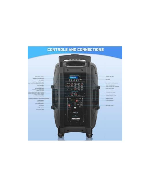 The Pyle PPHP1535WMU is a versatile and high-powered portable Bluetooth Pa speaker system perfect for karaoke, public events, and on-stage performances. It features a 15" subwoofer and 1.34" tweeter for rich, full-range sound with a maximum output of 1600W. The speaker supports Bluetooth wireless streaming, MP3 playback via Usb/Sd cards, and Fm radio. With multi-color flashing Led lights, a built-in rechargeable battery, and adjustable sound settings, this system is ideal for both indoor and outdoor use. The included wireless Uhf microphones, rolling wheels, and carry handle make it easy to transport and set up.