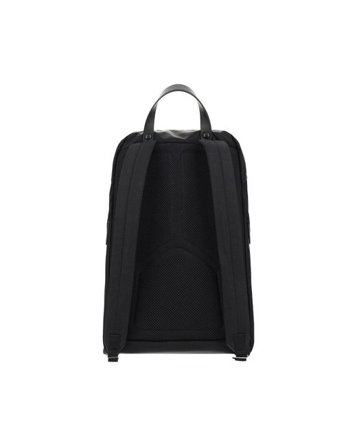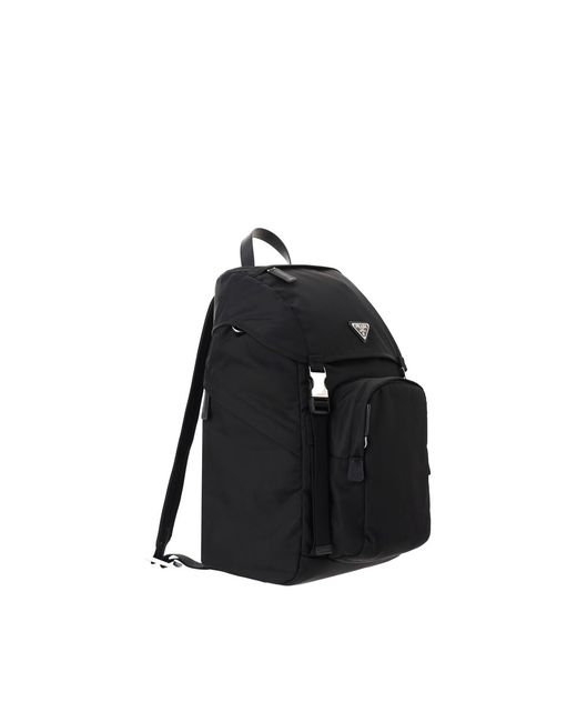 Re-Nylon Backpack by Prada, enamel triangle with brand logo appliqué on front, round handle, double adjustable shoulder straps, front flap closure, drawstring closure, zippered pockets, mesh panels, single compartment, and interior zippered pocket.