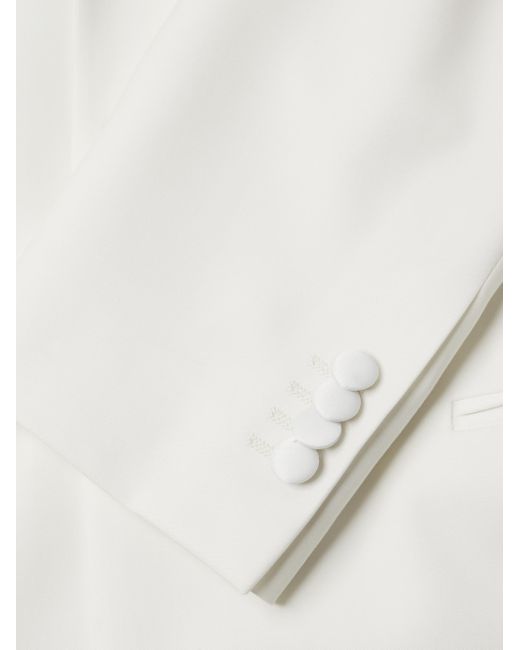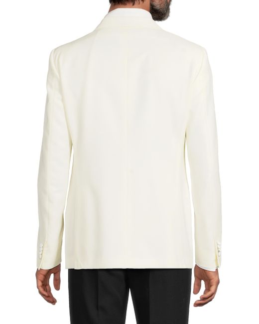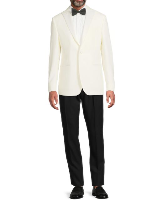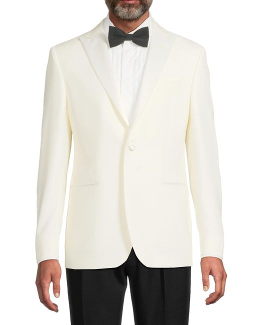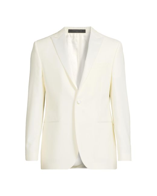 This Corneliani dinner jacket is crafted of luxurious virgin wool and highlights satin peak lapels for timeless allure. Side welt pockets, stacked button cuffs, and a single button closure lend refined elegance to this style. Peak lapels Long sleeves, stacked button cuffs Chest welt pocket Side welt pockets Back dual vents Front single-button closure 100% virgin wool Lining: 100% viscose Dry clean Imported SIZE & FIT About 30" from shoulder to hem Model measurements: 6'2" tall, 40" chest, 31" waist Model is wearing a US size 40R. Men Luxury Coll - Formal Wear > Corneliani > Saks Fifth Avenue > Barneys. Corneliani. Color: Off White. Size: 38.