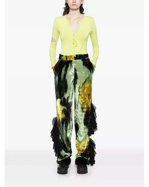 melting bloom green velvet front hook and zip fastening belt loops all-over graphic print two side inset pockets ruffled detailing two rear welt pockets