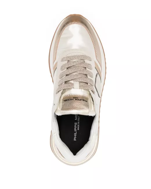 gold-tone metallic finish panelled design leather trim suede panels front lace-up fastening contrasting branded heel counter logo patch at the tongue appliqué logo round toe branded insole French terry lining chunky rubber sole